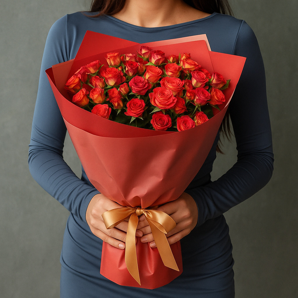 Эффектный букет кустовых роз в ярко-оранжево-красной гамме — это воплощение страсти, энергии и радости жизни. Сочные оттенки бутонов создают праздничное настроение и дарят заряд положительных эмоций. Такой букет станет безупречным подарком для выражения любви, благодарности или поздравления с любым торжеством. Композиция подойдёт для дня рождения, юбилея, романтического вечера или делового события, когда важны стиль и впечатление.